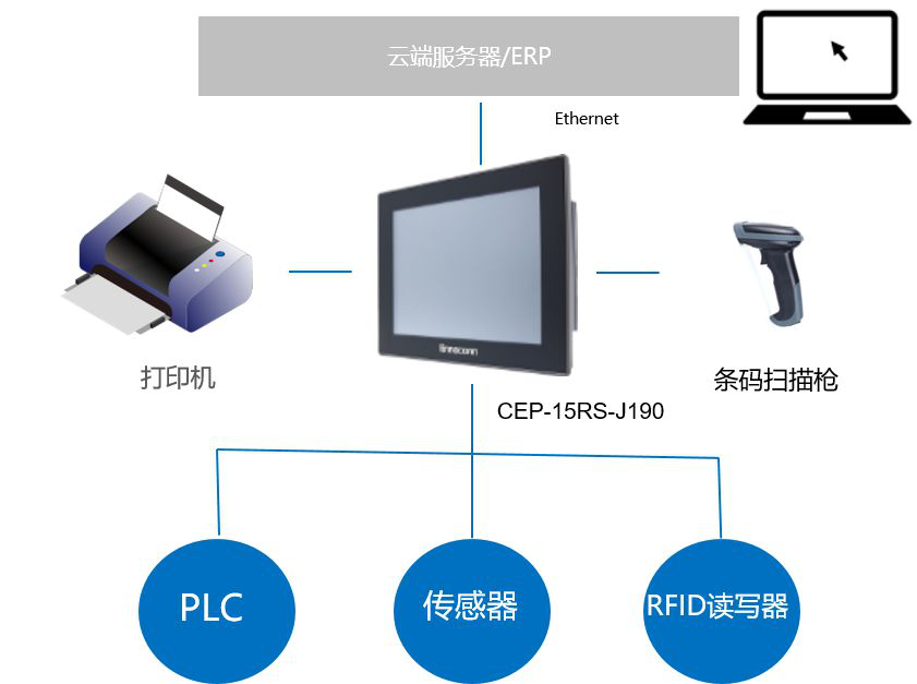 根據客戶需求Ennoconn做出完整解決方案。富士康15寸工業平板電腦作為MES系統在生產車間使用,承上接收ERP(企業資源計劃系統)業務訂單下達、客戶需求說明、排產工單等信息并下達投產指令給下層設備及人員。MES下層SCADA(采集與監視控制系統)連接PLC、傳感器、RFID讀寫器、 條碼掃描槍、打印等機收集數據——物料庫存、生產狀況、測試品質狀況、物流及達交狀況。MES可以將ERP整理的信息與SCADA收集的數據通過LED顯示屏進行信息發布,如實清楚的反饋至前端及客戶端、以達到車間制造工業化、信息化兩化融合。